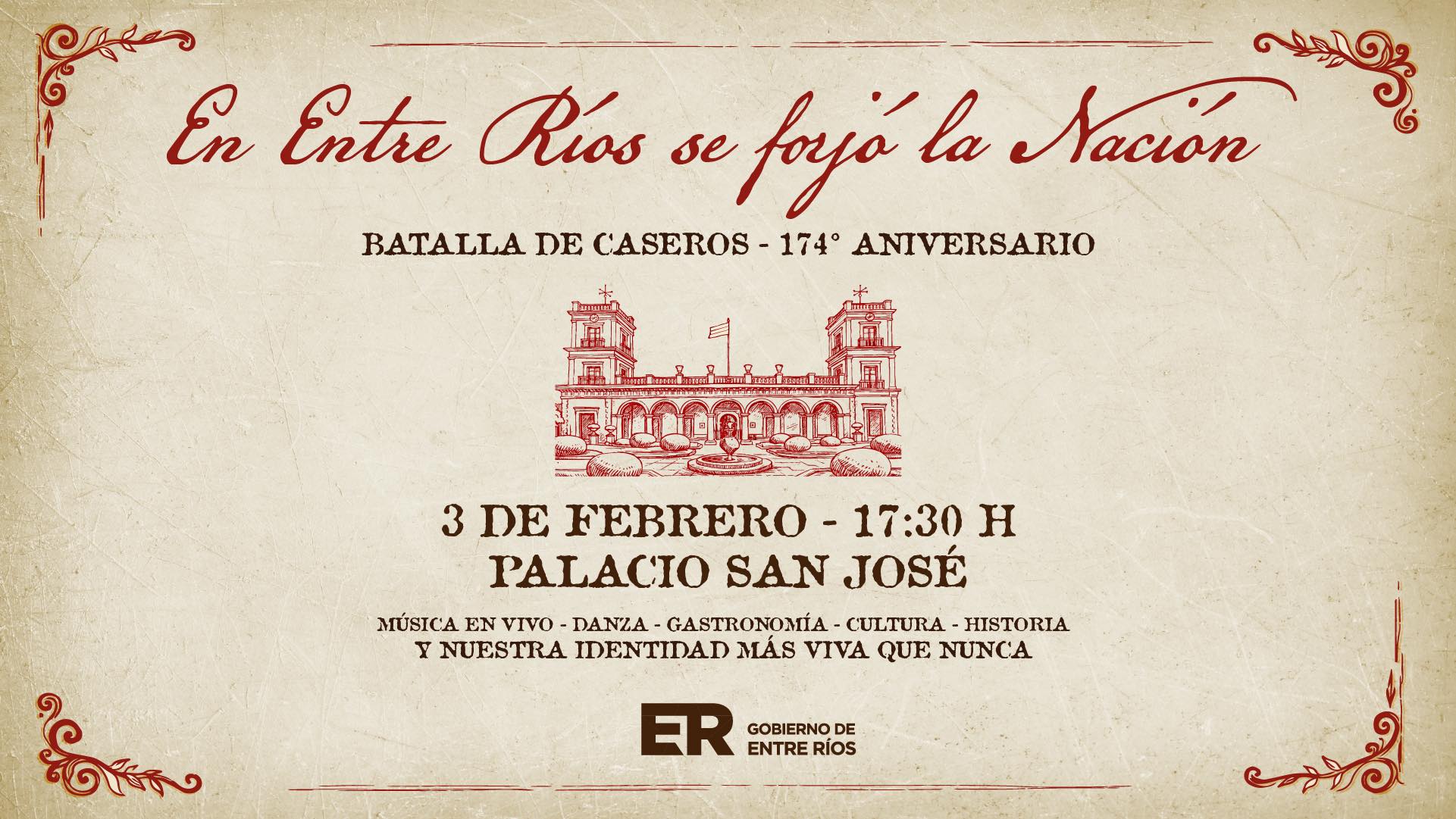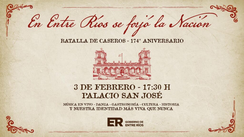 El próximo martes 3 de febrero, la provincia de Entre Ríos conmemorará la Batalla de Caseros con un acto central en el Palacio San José, en Concepción del Uruguay. La jornada contará con propuestas culturales y artísticas de gran nivel y será encabezada por el gobernador Rogelio Frigerio, junto a autoridades nacionales y provinciales.